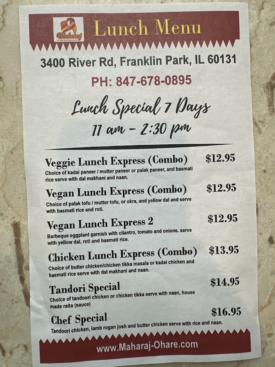Welcome to Maharaj Indian Grill Restaurant & Banquet, a delightful haven for authentic Indian cuisine located at 3400 River Rd, Franklin Park, IL. The menu is a well-curated journey through India’s rich culinary landscape, starting with Chef's Recommendations. Indulge in the Maharaj Dinner Special for 2, featuring succulent Tandoori chicken, flavorful seekh kebab, and indulgent Rogan Josh, all for $52. For those dining solo, the Maharaj Dinner for 1 at $28 offers similar enticing flavors. The diverse array of Indian breads, like Paneer Kulcha and Naan, beautifully complements each meal. Sweet endings await with Gulab Jamun and Kheer, ensuring a complete dining experience. Customers rave about the generous portions, authentic flavors, and friendly service, making it clear that Maharaj is a must-visit gem for any food lover. Enjoy a cozy, inviting atmosphere while savoring exquisite dishes that reflect India's culinary heritage.